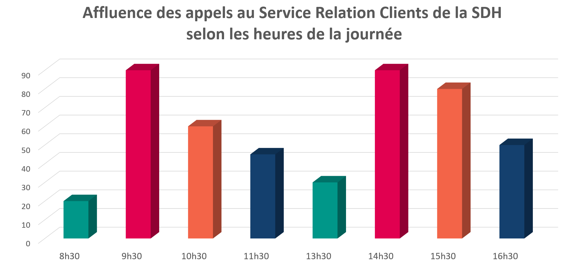 Les services du siège social, des antennes de proximité et des permanences de la Société Dauphinoise pour l'Habitat sont à votre disposition. Si vous êtes locataire SDH, merci de nous contacter en passant par votre compte locataire. Si vous cherchez à joindre notre Service Relation Clients par téléphone, privilégiez les heures de plus faible affluence : 8h30, 11h30, 13h30 ou 16h30 (Graphique des heures d'affluence au standard téléphonique).